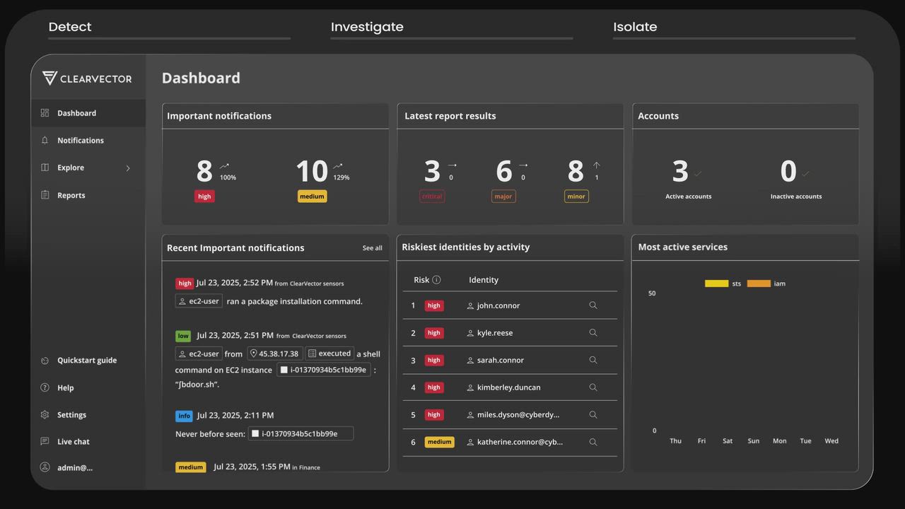 When risky activity is detected, ClearVector enables instant isolation of compromised identities, S3 buckets, Lambda functions, and other resources with a single click - without breaking your production environment. This surgical precision stops attacks in progress while you investigate, with easy rollback once verified.