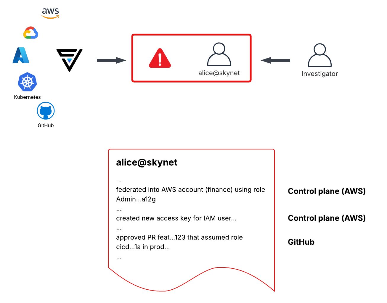 To illustrate, imagine you are responding to an incident in production, ClearVector points you to an identity, alice@skynet, that federated into your production environment via Okta. Although you have a unified view of this user's activity across production, Figure 1 illustrates what you know at this point in the investigation - Alice performed some activity in prod, created an access key, and approved a PR in GitHub. At this point, this may be a compromised identity - you need more information about Okta user “alice@skynet” from the IdP (Okta) itself.